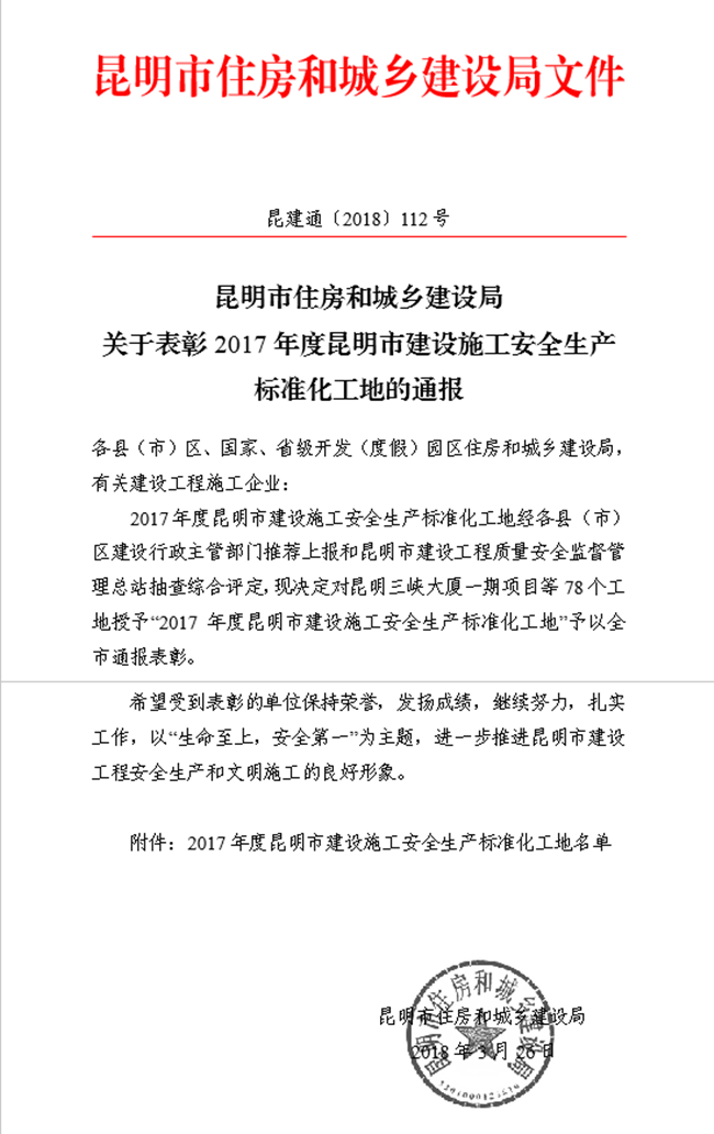本網(wǎng)訊(通訊員 張 好 報道)近日,昆明市住房和城鄉(xiāng)建設局下發(fā)《關(guān)于表彰2017年度昆明市建設施工安全生產(chǎn)標準化工地的通報》,對昆明三峽大廈一期項目等78個工地授予“2017年度昆明市建設施工安全生產(chǎn)標準化工地”予以全市通報表彰,其中,居正公司實施的滇池旅游度假區(qū)大漁片區(qū)B11地塊項目和云電投裝配工業(yè)基地8號地塊公租房項目獲得表彰。